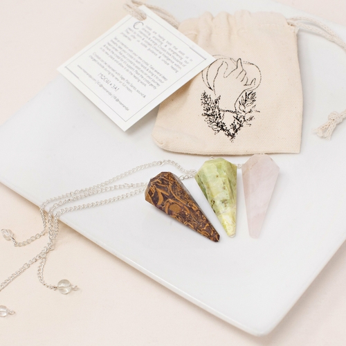 A pendulum arrives inside a branded Moon and Jai pouch, instructions on use included.